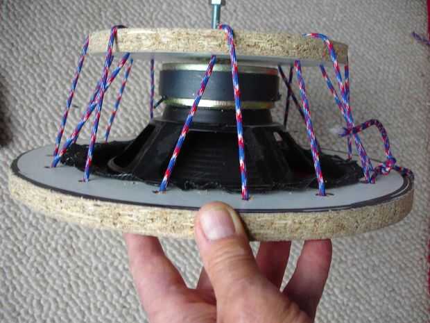 Cuando es todo ir atada, vuelta apretando los cordones sin perder la forma, el círculo posterior del tablero debe permanecer paralelo alineado con la parte frontal del altavoz. No tiene que ser realmente apretado.