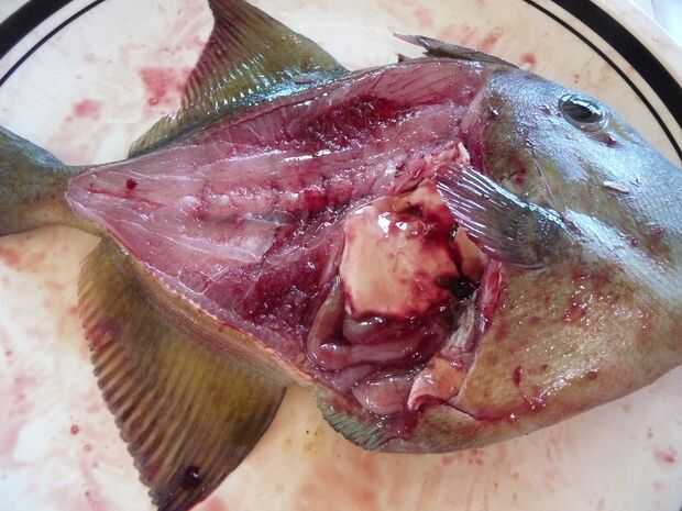 Cuando el pescado es fileteado en ambos lados, limpia hacia fuera de la cavidad del estómago, intestino, cortando todos los tejidos del órgano. Trabajar los dedos en la cavidad de la cabeza y extraer cualquier tejido residual allí también. Los ojos son bastante baboso en este punto. Puede recortar ahora o esperar hasta que el pescado se seque.