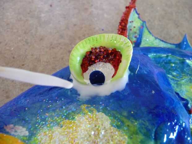 Los globos oculares: Pintar previamente un par de conchas marinas (o botones) y pegar en su lugar como en la imagen.