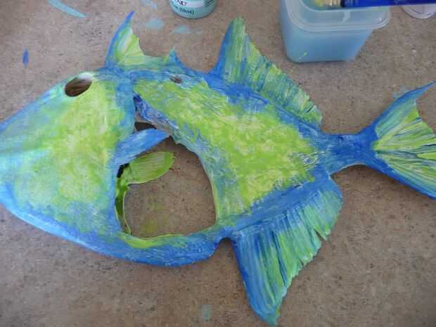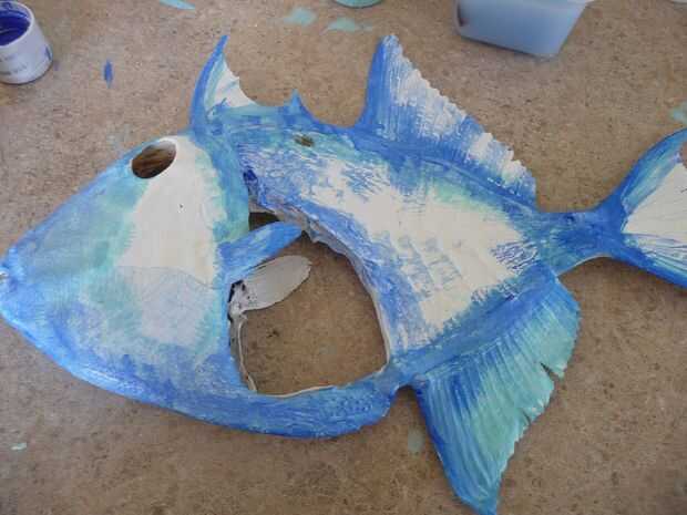 TAMBIÉN: Como pintar una escena intrincada en los lados de tus peces, medir y cortar algunas hojas de papel para pegar sobre la caja torácica. Ver las últimas fotos de algunos en el paso 4 para una visual. ;-)