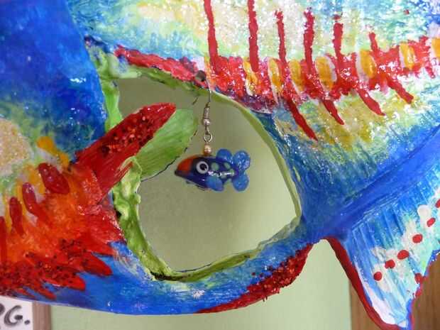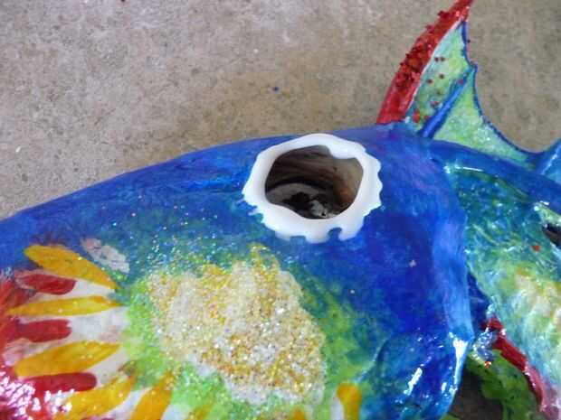 Una vez que has terminado tu obra maestra de peces (y se han secado la pintura y el pegamento) dan el pescado unas cuantas capas de pintura de aerosol de brillo claro y una capa de brillo.