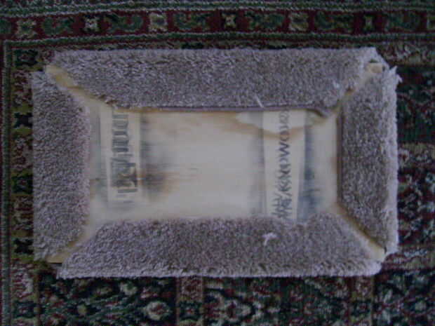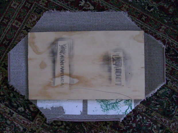 Una vez que los agujeros perforados y las directrices de mi lápiz, corte la alfombra y rocía algunas super pegajoso pegamento adhesivo en la madera. Hice una plantilla de una bolsa de papel y burló primero, para ver si estaba cerca. Dar el pegamento alrededor de 3 minutos a ser pegajosa antes de colocar la madera sobre la alfombra, luego doblar los bordes y stomp en él para hacer que pegue. Fácil peasey...