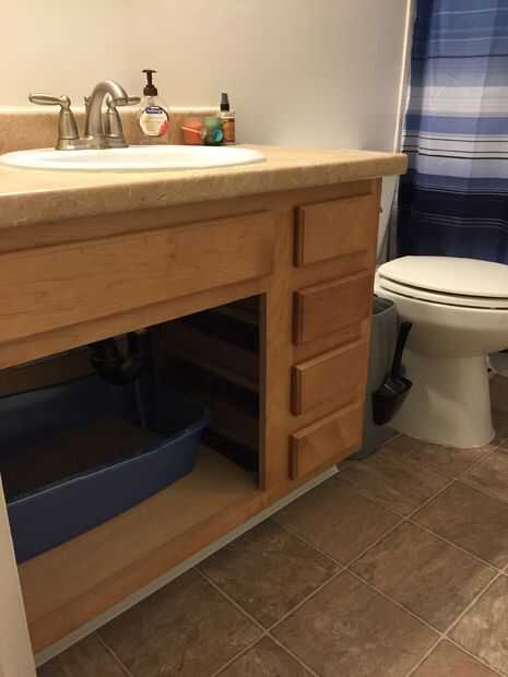 Tenía que haber una mejor manera de contener las piezas de basura redomado de cubrir el suelo de mi baño. Apenas utilizo el tocador en el baño para almacenamiento así que por qué no hacer un gato propio.