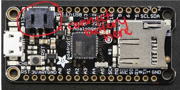 La batería puede conectarse el Arduino al poder en varios lugares. He encontrado esto (ver foto) más conveniente. La batería es más fácil y permanentemente conectada y para cargar la batería, usted simplemente conecta el Arduino al PC.