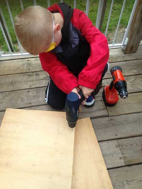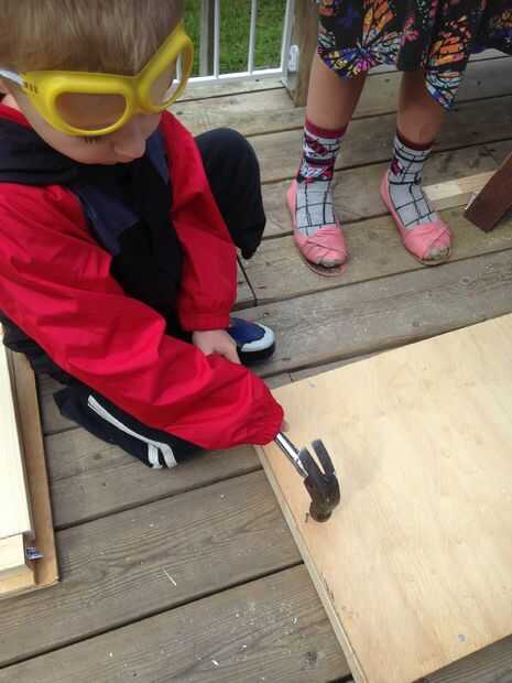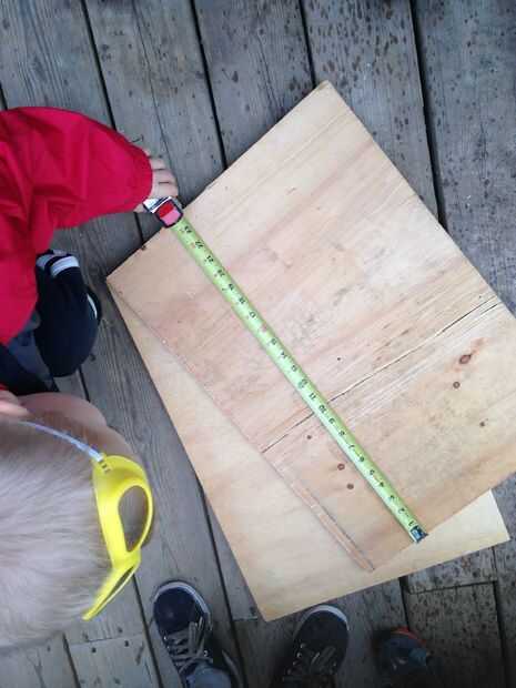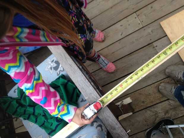 Sacó un plan áspero para el marco y tenía a los niños medir todo para el corte y la instilación. Fue un reto enseñar sobre fracciones de pulgadas, pero al final consiguieron la caída del mismo.
