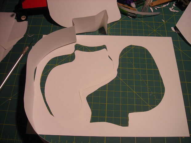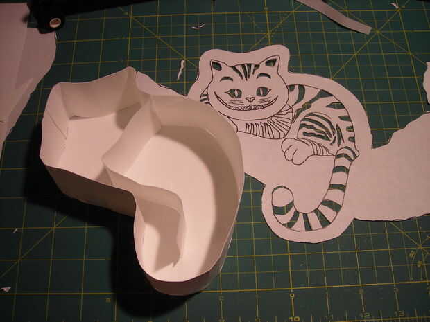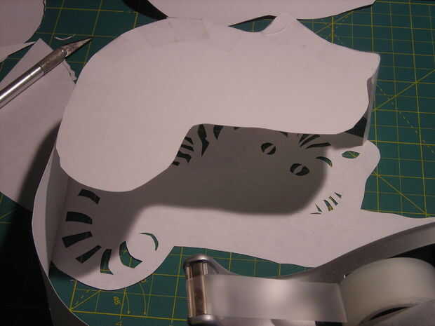 A continuación, tome una hoja gruesa de papel (yo usé papel de 65 lb) y corte una forma que cubra todas las aberturas en el patrón de gato, pero no demasiado cerca del borde del diseño (véase una comparación en la segunda foto). Luego, corte una tira de papel grueso de unos 5cm de ancho y colocar alrededor del borde de la forma a recortar.