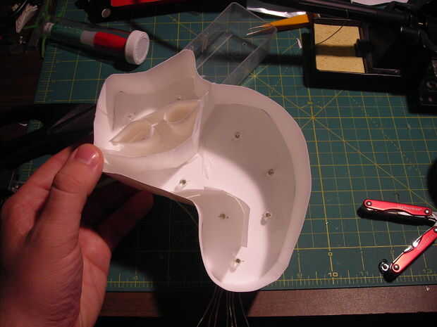 Para insertar un LED en el marco, hacer un corte con un cuchillo y alimentar los conductores a través de la parte delantera. Fijarla con un poco de pegamento caliente en la parte posterior.