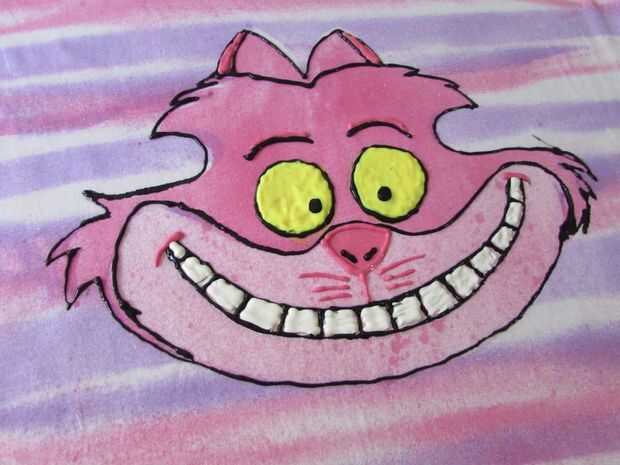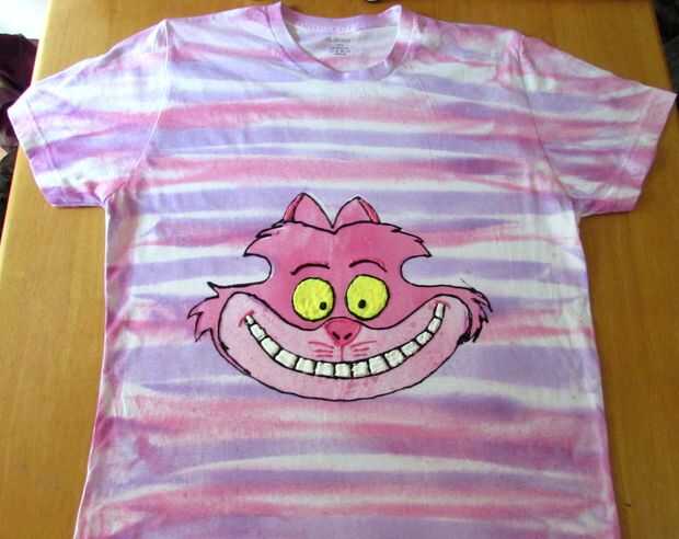 Me encanta camisas gráfico así que pensé de transformar mi camisa blanca con secado de tintes y pinturas para tela 3D con un diseño de gato de Cheshire. Creo que resultó muy bien.