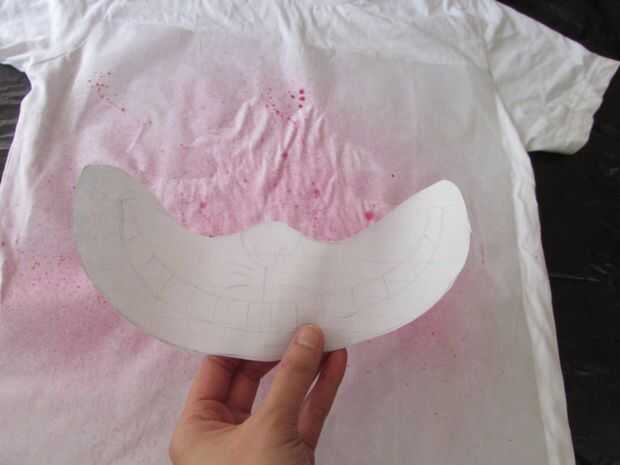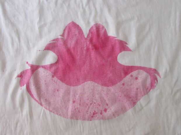 Corté la parte de la boca del gato del corte que puse a un lado y pegado que a la camisa. Esto me permitirá rociar nuevamente con la magenta en la plantilla para hacer la parte superior de la cabeza de un color más oscuro. Esto es evidente una vez que retiras la plantilla principal principal. (imagen 4)
