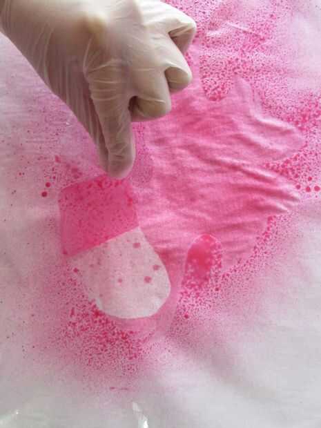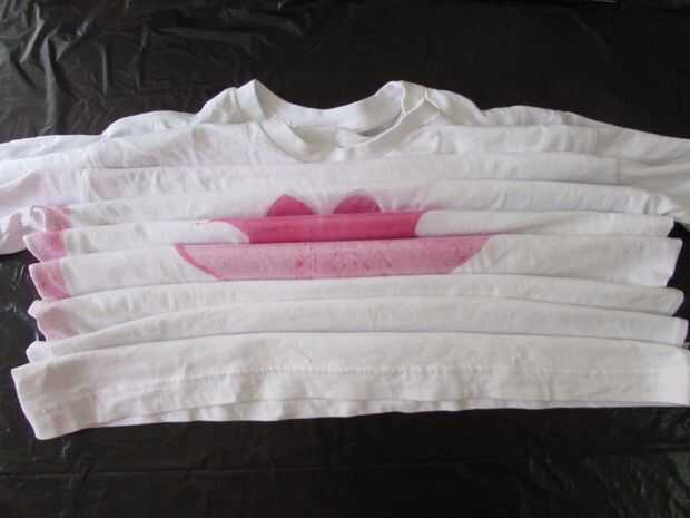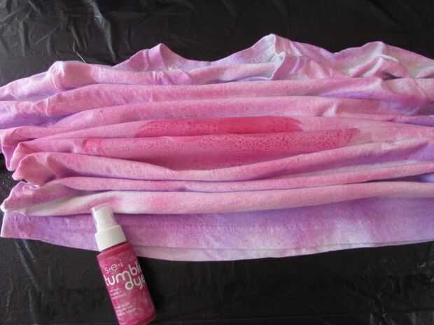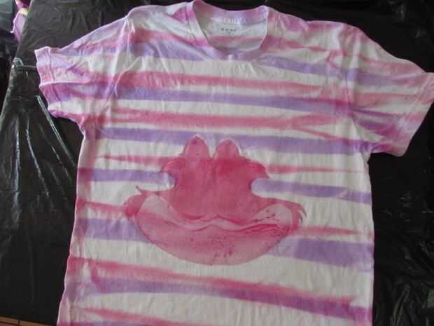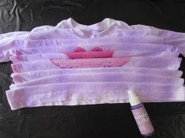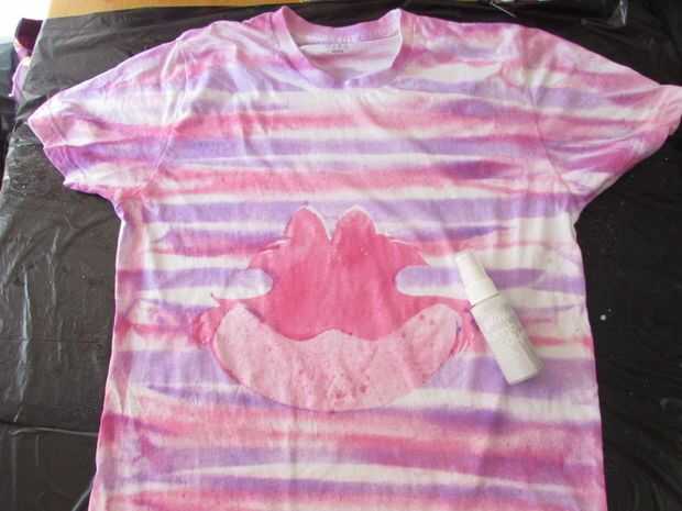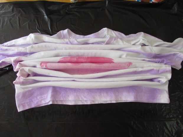 Para hacer las rayas, hice pliegues horizontales en la camisa y rociados con el tinte de la lavanda. Entonces plisado las partes blancas de la camisa y el tinte magenta rociado. Usted puede cubrir tanto la parte blanca como usted tiene gusto. Cuando estés satisfecho con las rayas, la camisa entera del aerosol con el brillo.