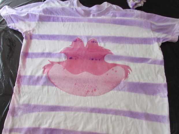 Entonces quité la plantilla principal para descubrir el resto de la camisa. Esta vez, os adjunto la otra mitad de la cabeza al gato. Necesitamos jefe de Cheshire cubierto esta vez para protegerlo mientras estamos haciendo las rayas para el resto de la camisa.