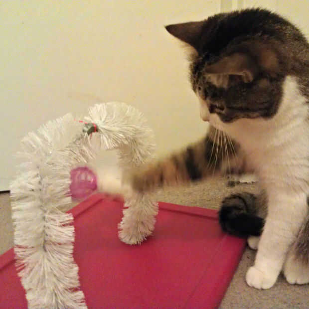 Este juguete de gato elimina el desprendimiento de piel, masajes y ofrece entretenimiento barato para su gato favorito. El juguete de gato colgando es divertido para jugar. Las cerdas tiesas masaje su gato como va debajo o al lado del arco. Las cerdas atoren también suelta pelo de mascota. Destinados principalmente a los gatos, el juguete podría también utilizarse con otros tipos de mascotas.