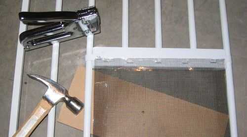 A continuación, jugar un pequeño juego de "alineación" para conseguir la proyección contra la parte posterior de la sujeción superior de modo que la aleta se moverá libremente. Utilice la pistola de grapas para virar la pantalla en su lugar. Si las grapas no salen en la madera, en, golpear suavemente, con un martillo hasta que estén al ras. Si toca demasiado, las grapas se romperán a través de la cinta y la pantalla.