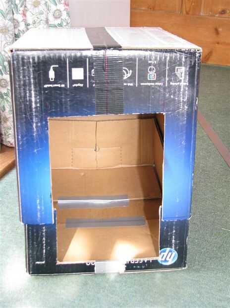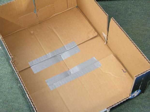 Dar rigidez a las mitades de la dos caja poniendo globos de adhesivo entre las solapas de cartón y presionar juntos. El adhesivo solvente no 'olvida clavos' utilicé es grande. Agarra las dos superficies juntas y establece rápidamente, pero como yo estaba continuando con la construcción también utiliza cinta adhesiva para dejar las cosas en movimiento antes de los adhesivos. Una vez firmes las mitades de la dos caja, deslice una media en el adhesivo otro y trabajo entre tantas de las superficies como sea posible.