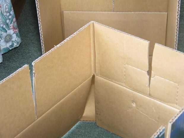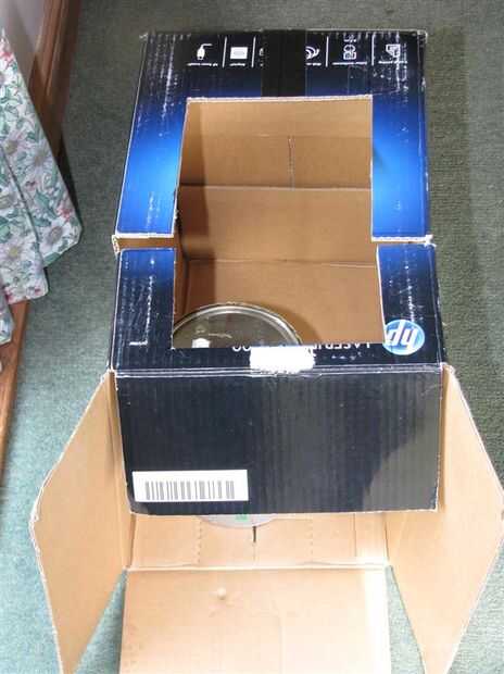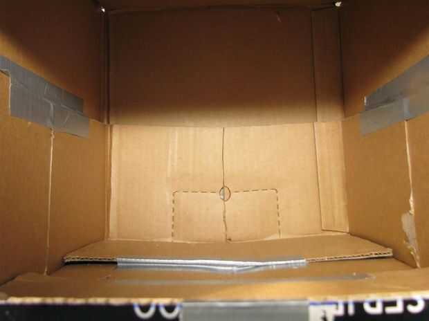 Marcar y cortar alrededor de la caja a la altura deseada y corte una sección de dos piezas para la entrada. En los otros tres lados, corte una ranura de 'V' en el centro para permitir que los extremos doblar hacia adentro. Esto es necesario para reducir la anchura ya que una parte de la caja debe caber dentro del otro. Las notas del cuadro dan más detalles sobre todos estos pasos.