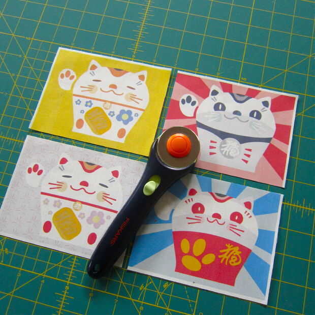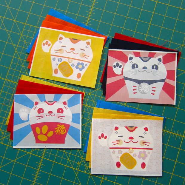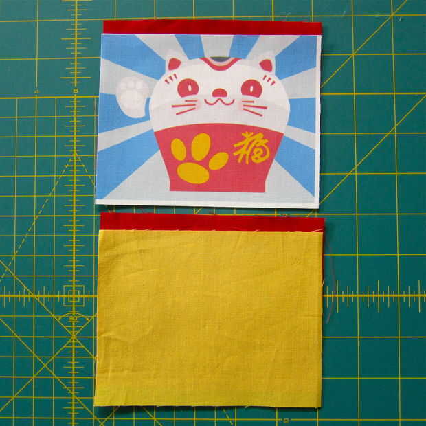 Usando un cortador rotativo y una almohadilla de corte cortar tela estampada y tres capas de tela del mismo tamaño (4,25 x 5,5 pulgadas) de coordinación utiliza todos los colores sólidos pero no dude en utilizar lo que los patrones o colores que desee.
