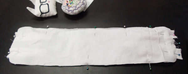PIN ambos lados, teniendo cuidado de las piernas en lugar del perno. Cosa una costura alrededor del borde dos veces para asegurarse de que no hay fugas de arroz, asegurándose de dejar un pequeño espacio a lo largo del borde largo así que usted puede dar vuelta derecha hacia fuera.