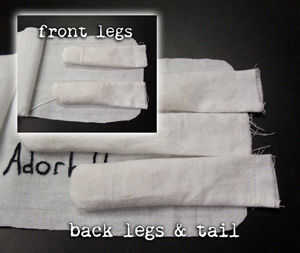 Por lo tanto, ahora es el momento para el cuerpo kitty. Cuidadosamente corte dos de su forma del cuerpo (alrededor de su bordado). Asegúrese de que es al menos tan larga como la asignación de teclado además de costura. Coloque el lado derecho de dos capas juntas. Tome algunos kitty patas y una cola y colóquelos frente hacia adentro, asegurándose de que bastantes de los extremos se dejan hacia fuera capturado por la costura. Lo mismo en el otro extremo con las patas delanteras.