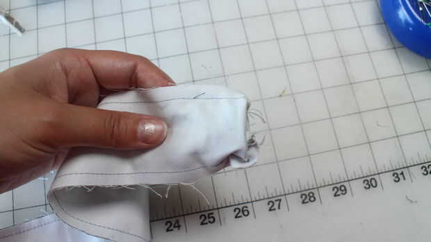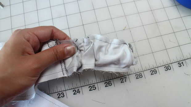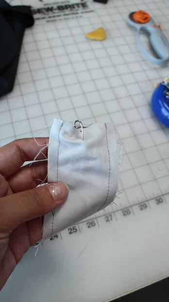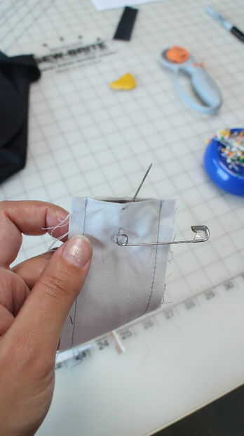 -Usando un alfiler grande, empuje a un lado en el extremo de una de las asas cosidas