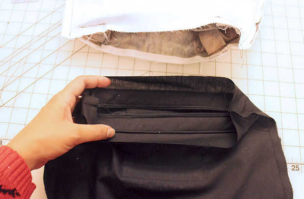-Abrir la cremallera de la capa de la guarnición y el pin la parte superior del revestimiento a la parte superior del cuerpo del bolso, coser 1/2" todo.