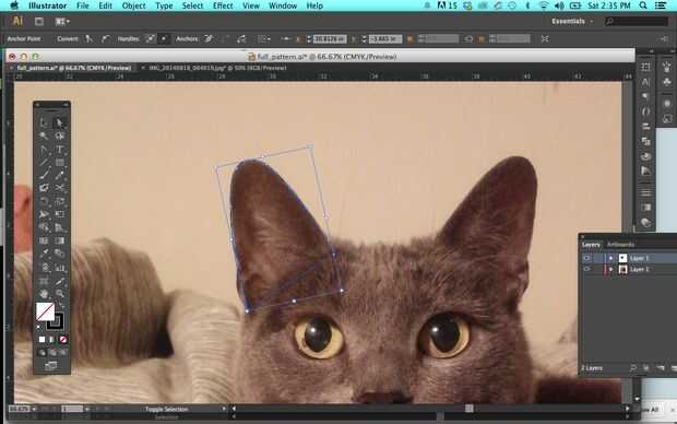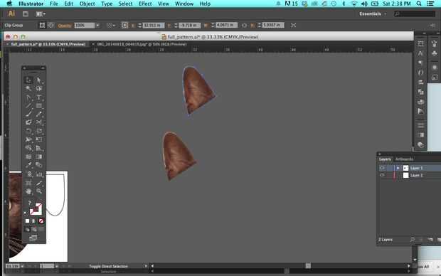 -Coge uno de los patrones de oído y ponerlo sobre la foto. Cambiar el tamaño de la foto y gire el patrón del oído hasta que estés satisfecho con la manera en que la foto llena el patrón. Me decidí a manipular un punto de anclaje para cortar a mi patrón un poco más cerca del borde de mi foto.