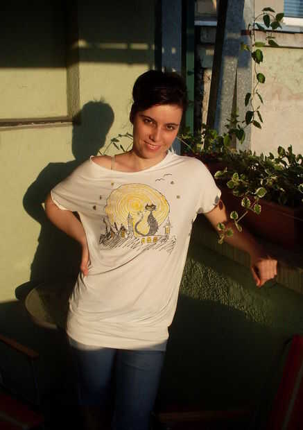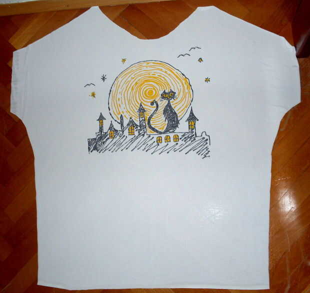 mano de pintado esta camisa simple con 3D-trazadores de líneas (pueden ser utilizados para textil, papel, madera, vidrio y metal). Después de terminar todo el proceso, la camisa es planchar para fijar los colores y la ropa es lavable a 40 grados centígrados.
