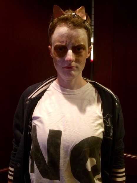 que estábamos seguros íbamos a ver todos lados esto Halloween, pero sería aún un poco juego y pasar un buen rato, por lo que elegimos ser famoso internet gato meme gato gruñón y Nyan Cat. Para el gato gruñón, acabamos de una camiseta blanca que tenía ($0.00) además de estarcidos sobre la palabra 'NO' con tela pintura en aerosol ($6,00) usando papel de congelador ($2,00). Cortar las letras N y O y planchar el inverso de ellos (por lo que tenía un agujero en el papel y no el N o O física) sobre la camisa, luego rociar la pintura sobre la camiseta. También usamos maquillaje traje de Walmart (blanco y marrón, $2,00) y algunos de mis ojos marrón oscuro de la sombra de la pintura de la cara. Luego creó la banda con algunos limpiapipas (sólo 1 negro uno, doblado en forma de triángulo) y un medio pliego de cartulina marrón para los oídos y había torcido en la diadema.