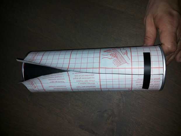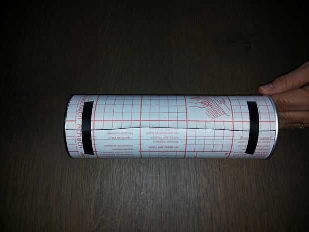 Utilizar el papel para cubrir el plástico. Asegúrese de que va todo el camino alrededor del contenedor, pero deja un poquito de espacio entre las capas así que usted puede mover alrededor. Esto es necesario para ajustar el tamaño de los agujeros que vas a hacer en el siguiente paso. Hacemos esto para que no se pegan en el tamaño de los mordiscos más adelante pones en (algunos gatos como variar su comida más que otros). Pegan con algún plástico cinta o sobra por ahora.