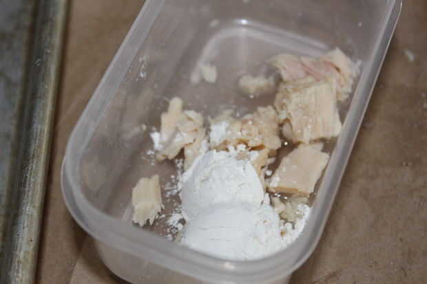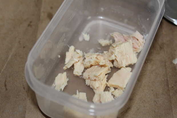 Abrir una lata de atún y añadir 1 cucharada sopera a un recipiente con 1/2 cucharadita de aceite de canola, 1 cucharadita de harina y 1/2 cucharadita de crema.