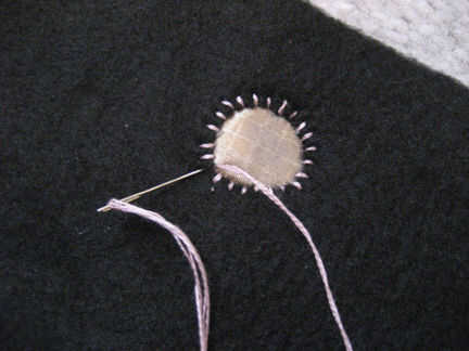 Alinearla, añadir algún pegamento para tela. Luego coloque a la tela de la parte trasera sobre todo haciendo una especie de "sandwich" de tela. PIN todo para arriba; entonces usted está listo para coser en la máquina. Simplemente siga el trazo de lápiz/tiza. No coser todo el perímetro; dejar unas pulgadas para que usted puede finalmente vuelva al todo. Llamaremos a esta apertura la "costura de relleno".