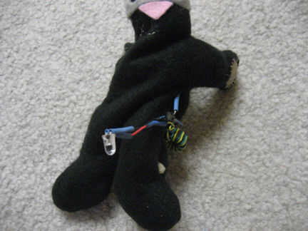 Vuelva la muñeca ("sándwich de tela"). Usted puede tener acceso a los alambres para las patas y el LED a través de la "costura de relleno". Soldadura y calor encogen los cables en el circuito Joule Thief.