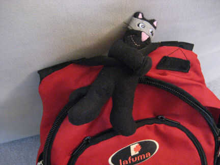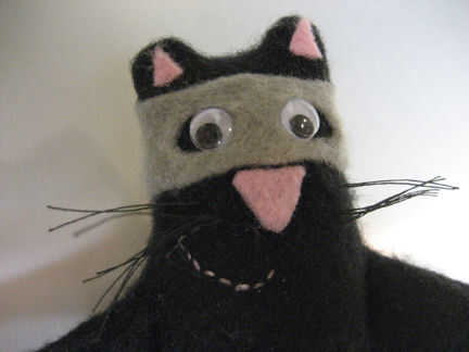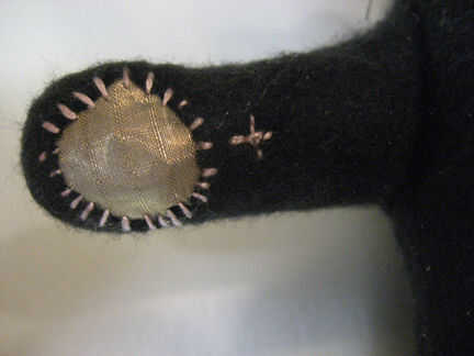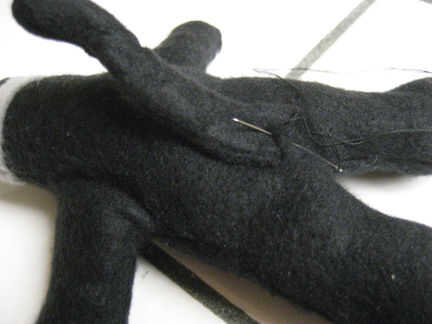 Coser una cola de retazos de tela negra. Toma dos capas de tela y coser una especie de tubo torcido. Corta el "tubo" y vuelta adentro hacia fuera. Coser la cola al cuerpo. Esto es importante! Proporcioné una foto para mostrar que la cola va en la parte posterior.