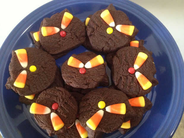 esta receta fue encontrada en un periódico hace unos 15 años. Este año hemos decidido cambiar un poco la receta porque no hemos podido encontrar "pastillitas rojas" por lo que utilizamos habas de jalea roja.Hacemos estas galletas cada Halloween.