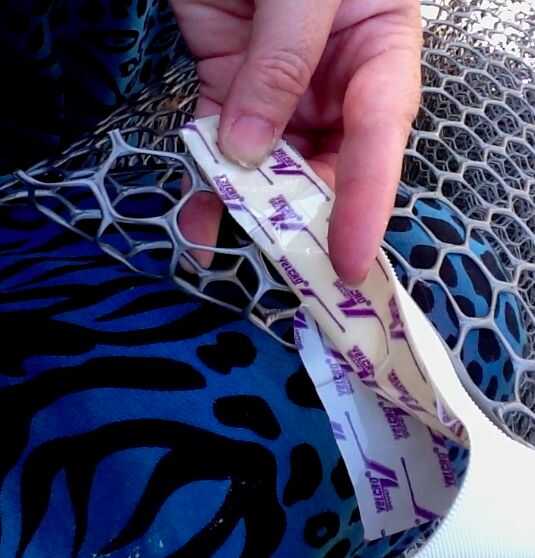 -Línea de un borde largo de la otra pieza de malla con ahora el borde la cinta gancho (todo el ancho de la cinta está bajo la malla). Poco a poco, pelamos la mitad de la base que está más cerca del borde de la malla y pegar la malla del adhesivo.
