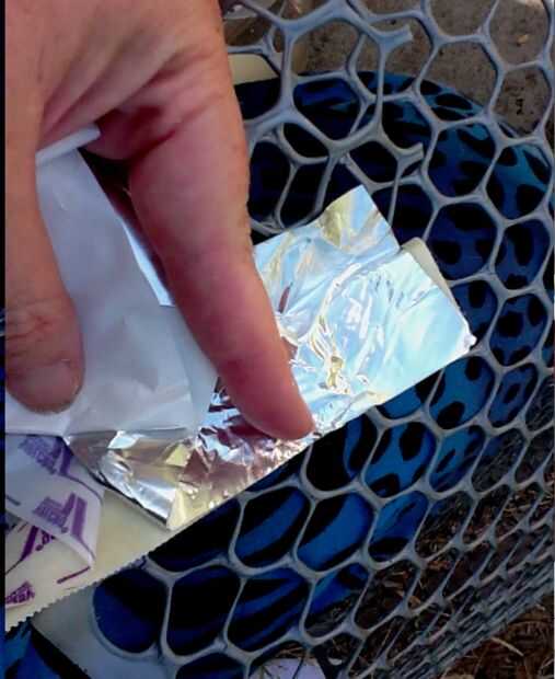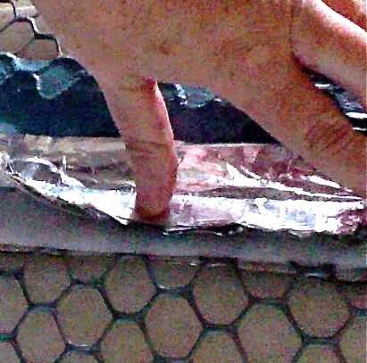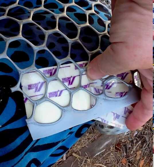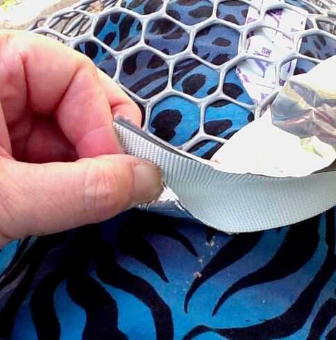 * Si su cinta de gancho y lazo no es "pegajoso respaldado", usted puede conectar a la malla con un epoxi o cemento que se mantiene flexible al secarse. O mano-cosen en. O máquina de coserlo si tu máquina es lo suficientemente resistente (hogar regular que puede no ser). O incluso utilizar las grapas Si no sobresalen los extremos afilados. Una vez que está asegurado en su lugar, poner la cinta de papel de aluminio sobre la parte posterior de la cinta del gancho como se describe arriba.