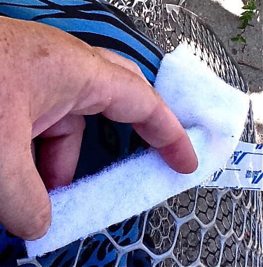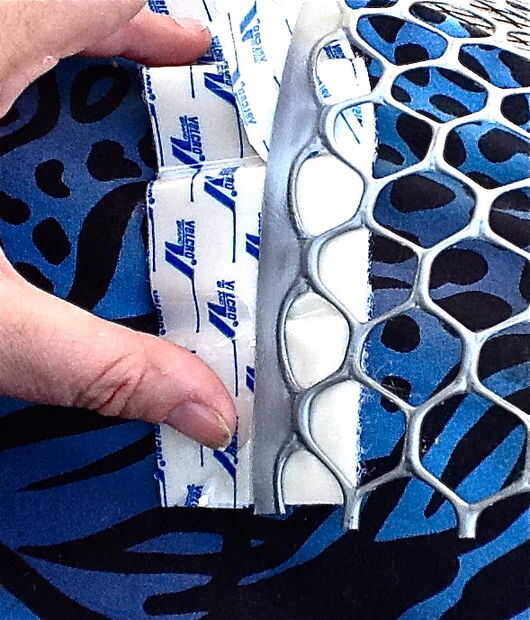 -Al llegar al final, doblar la otra sección de la cinta de la bucle hacia atrás sobre el borde de la malla. Entonces el respaldo apagado poco a poco y presione el lado adhesivo hacia abajo sobre el borde de la malla (y a través de la malla para el otro-lado pegajoso de la cinta). Ahora la pieza de la malla debe tener uno de sus bordes largos atados con cinta de la bucle, fuzzy lado hacia fuera.