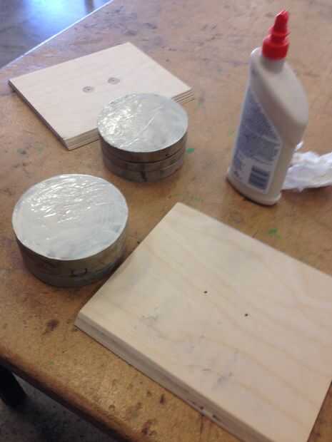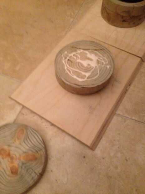 Luego pega las rondas arboladas entre sí y la base de madera con pegamento de madera y luego sujeta a establecer, por aproximadamente una hora.