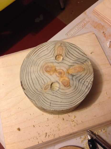 Luego utilicé una broca de 1/2 pulgada para perforar un par de muescas en la parte superior de la pieza base. Permiten los tornillos de la parte inferior de la pieza de madera contrachapada para sentarse, para que la madera sea al ras con la pieza base.