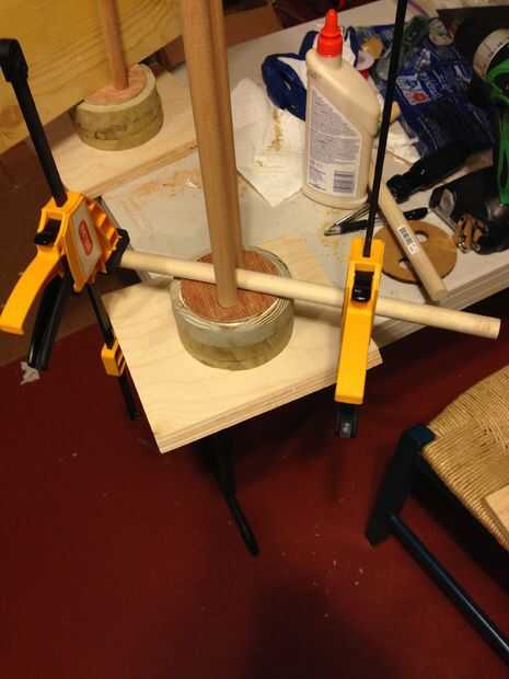 Entonces utilicé madera pegamento en cola el pasador de madera contrachapada de pieza a la pieza base y fijarlo con la abrazadera hacia abajo. Tenía que ser creativo con la fijación, como no había espacio suficiente. Una pieza sobrante de espiga vino en práctica para esto. Lo dejé durante una hora curar.