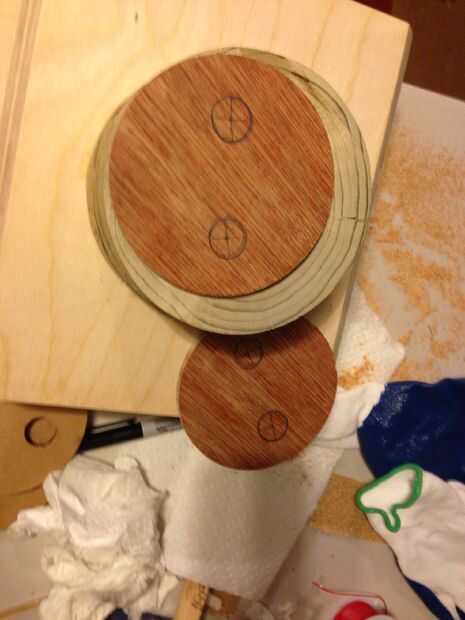 Otra vez usé el contorno de la cartulina recorte para marcar donde deberían estar los orificios. Luego, con la broca de 3/32, perforó un par de agujeros en la madera contrachapada.