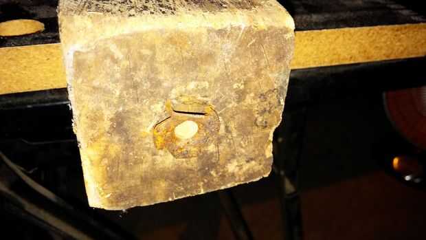 Tengo que quitar el metal T-nut al final del post. Esto fue utilizada para sujetar la pata a la mesa original. Ya que va atornillado a través de la placa base y en el post, necesitaba el parte movible del metal fuera del camino. De lo contrario el post no descansaría sobre la placa y los tornillos de nuevo posiblemente podrían golpear la tuerca de T. Con sólo leve haciendo palanca con un destornillador plano y un martillo, la tuerca de T fue quitada rápidamente.