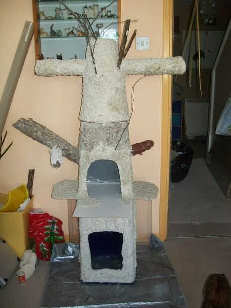 Hacer una cama para la parte superior de una pieza de wood.and poner tubo de cartón alrededor de él para que los gatos se sienten seguros.
