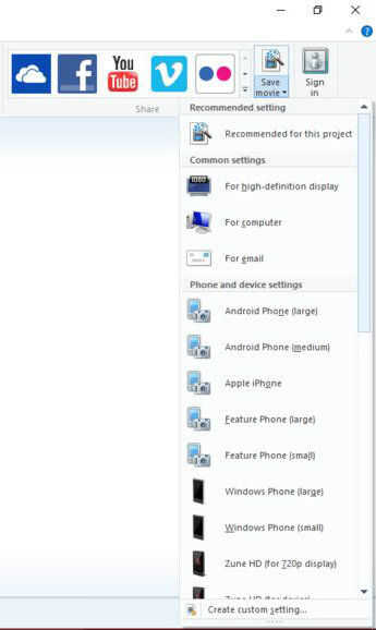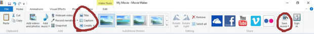 2. Si algo se guarda en un formato más usable de MPEG-4, haga clic en el botón "save movie" en la esquina superior derecha con la ficha "Inicio" seleccionada. Elija cualquier opción prefiere. Incluso hay una opción para subir el video directamente a YouTube, Twitter y algunos otros sitios web de medios sociales populares. Otra vez, al seleccionar una opción, aparecerá una ventana que permite elegir el nombre del archivo y la ubicación que guarda el video.