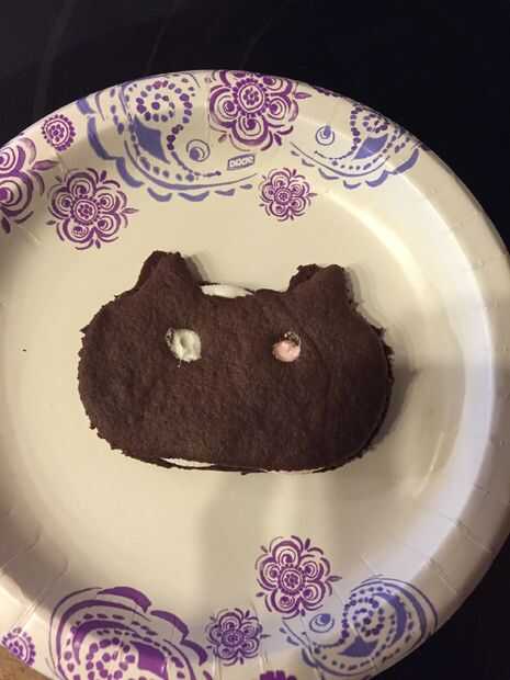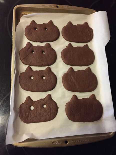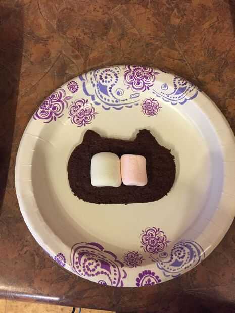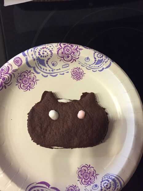Cuando los gatos terminen la cocción, dejar enfriar para poco a poco, el movimiento para el protector/de la placa se enfríe por completo. Ahora es un buen momento para hacer otros gatos si tienes masa extra. Ahora, vamos a acabar con ellos! Comienzo tomando ambos tipos de malvaviscos y cortarlos por la mitad longitudinalmente. Ahora, toma una galleta que no tiene ojos, darle la vuelta y poner un malvavisco la mitad a cada lado en el centro. Nuke en el microondas durante 10 segundos. Poner en una cabeza y limpiar los ojos. ¡ Felicidades! ¡ Estás acabado!