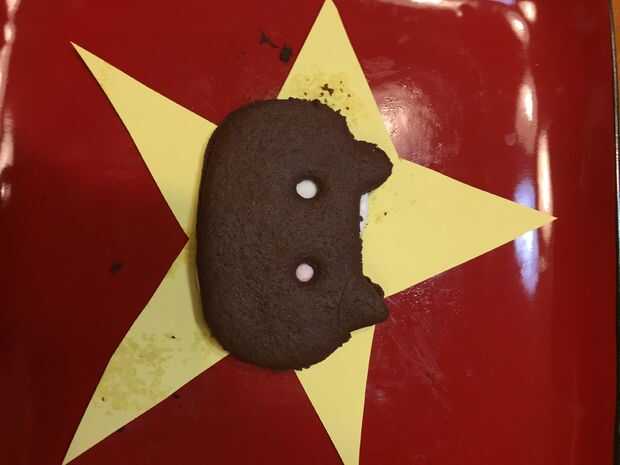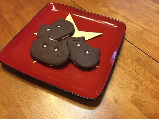 esta receta fue encontrada en un periódico hace unos 15 años. Este año hemos decidido cambiar un poco la receta porque no hemos podido encontrar "pastillitas rojas" por lo que utilizamos habas de jalea roja.Hacemos estas galletas cada Halloween.
