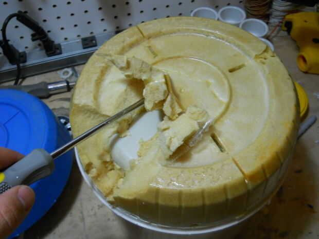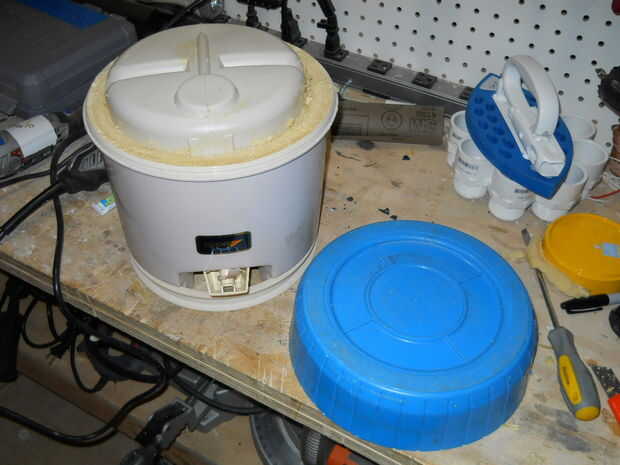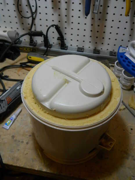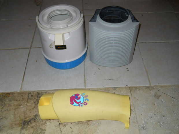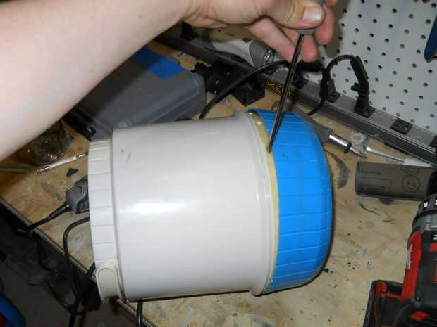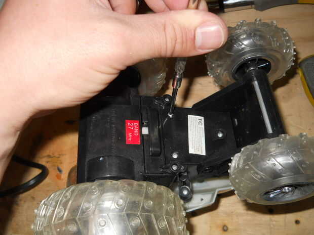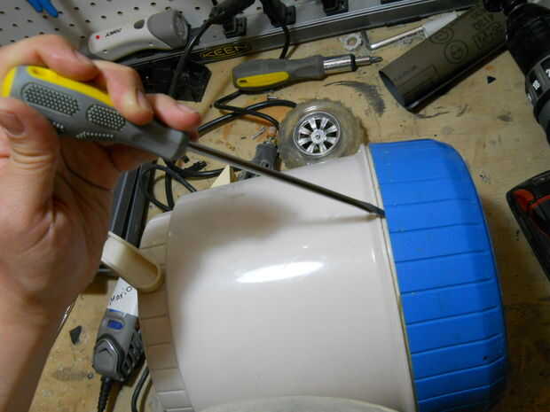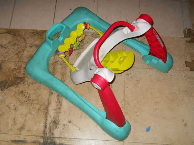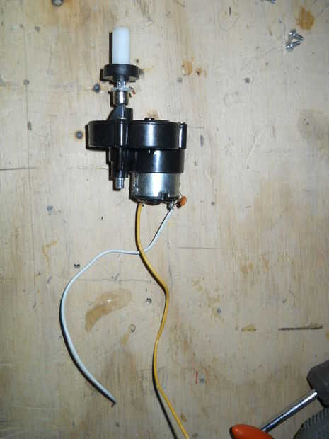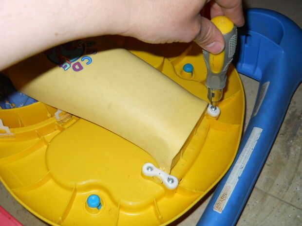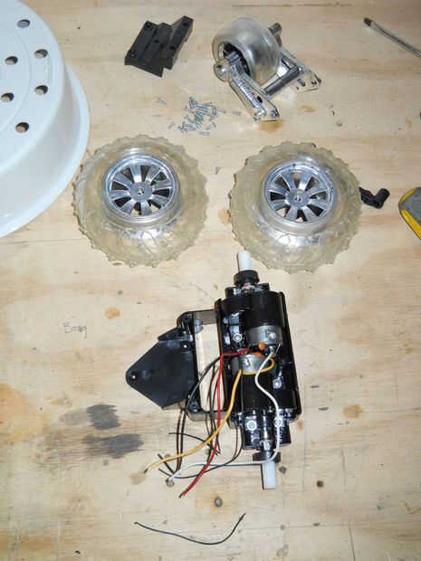 Tomé la mesa del bebé y quité la pierna delantera amarilla. Entonces, tomé el termo y quitar la parte inferior (el círculo azul) y la espuma de poliestireno. Desde el coche de juguete, separar la caja de engranajes con el motor y una rueda.