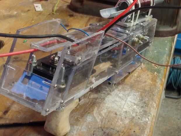 Construí la base en 3 secciones, la bandeja delantera con el cañón en la parte superior, la parte trasera con el mango y la parte superior trasera que contenía la mayoría de lo circuitos y panel de control. Todos ellos bien atornillados y podrían ser quitados fácilmente. Por desgracia no hacen planes detallados porque estaba muy limitado de tiempo en este punto, y literalmente la construcción de esta base por la sensación. Honestamente esto es absolutamente estúpido y le aconsejo que hacer planos muy detallados con medidas y tiempo real y esfuerzo ya que se está construyendo algo muy peligroso. No es mi mayor defecto.