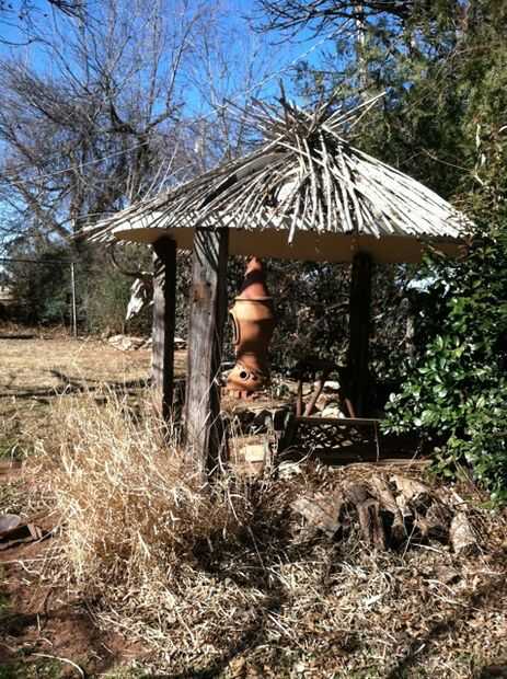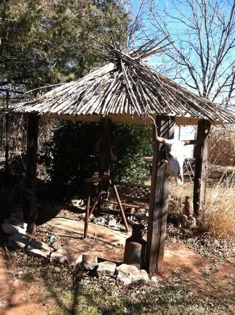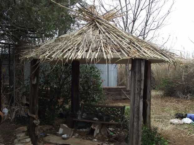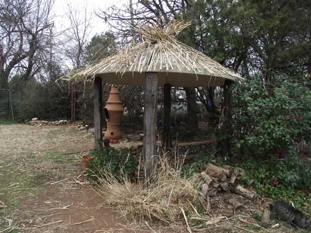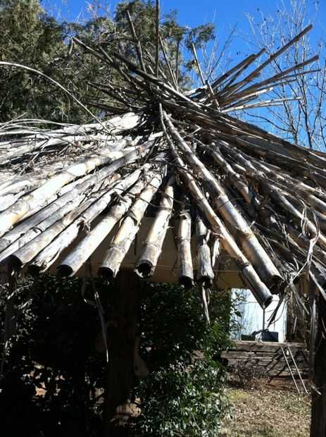 Con sólo el plato encima de los lazos, que parecía más una cúpula Grecian que un cenador, como sospeché que sería.  Tenemos algunos caña crece en el patio trasero. Cortar los postes a las longitudes de 8 pies. y en la parte superior del plato.  Para asegurarlos, hice un círculo 34,5 ft de alambre de la cerca lisa alrededor del borde del plato y extienda 5 pulgadas más allá de él.  Puesto que el plato es de 10 pies de diámetro, la circunferencia es