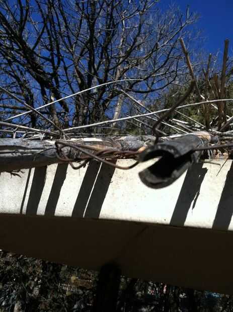 Que dividir cada uno de los polos de la caña en el extremo inferior y poner el cable en el split. Envuelve otro cable en la parte superior de los postes y había asegurado tanto del extremo del cable al alambre de primera, ya que yo no podía gatear por encima.