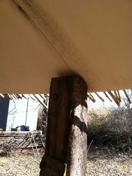 Quitado el plato de su montaje y cavaron los agujeros y el ferrocarril Cruz lazos. Han utilizado postes de acero más pequeños o postes de madera de 4 x 4', pero quería el aspecto rústico de los lazos de la cruzados. La Cruz lazos tuvieron que cortarse por lo que lo harían todo ser la misma altura cuando terminó y tuvo que ser cortado en un ángulo en la parte superior para que coincida con la pendiente de la antena parabólica. Después de configurar el plato encima de los lazos, atornillados a cada lazo con rosca de 1/2" material para pernos, arandelas y tuercas.